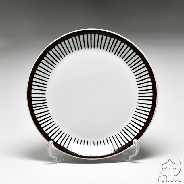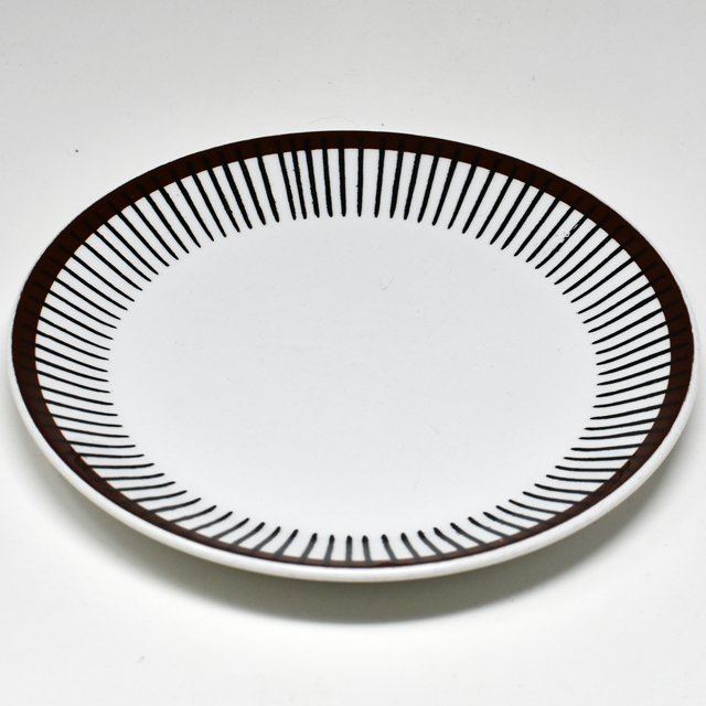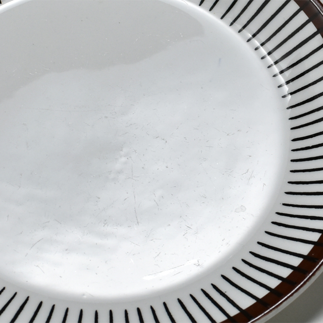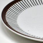 濃い茶で縁を引き締められたカップに、黒の手描きの線が並んでいます。黒のラインは手描きならではのゆがみや間隔の不規則さがあり、シンプルなデザインに味わいを加えています。ケーキだけでなく、サラダや取り分け皿にもお使いいただけるサイズです。