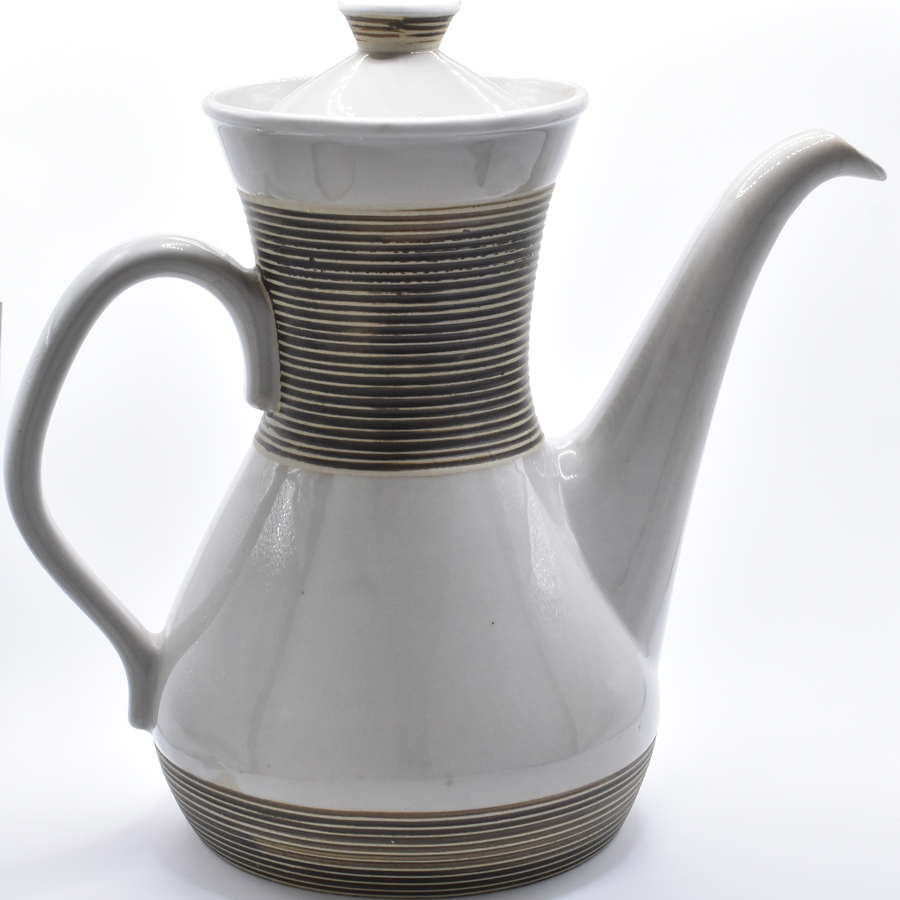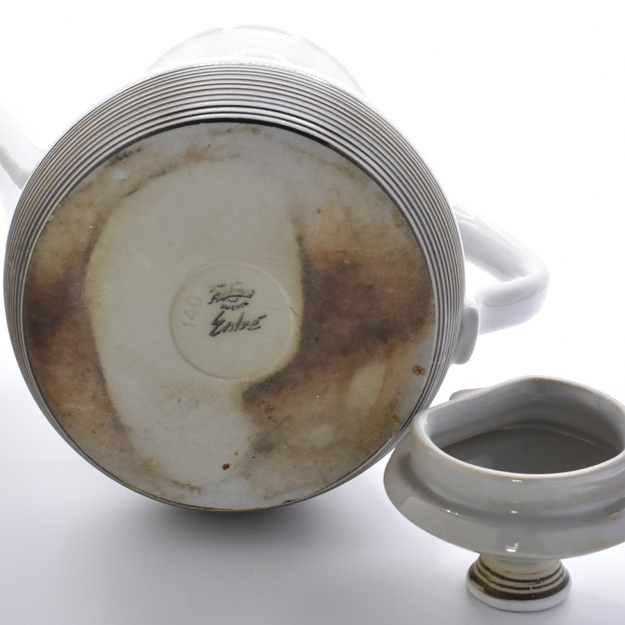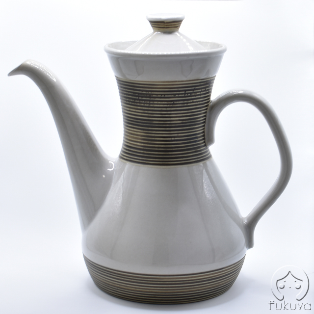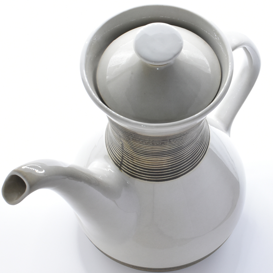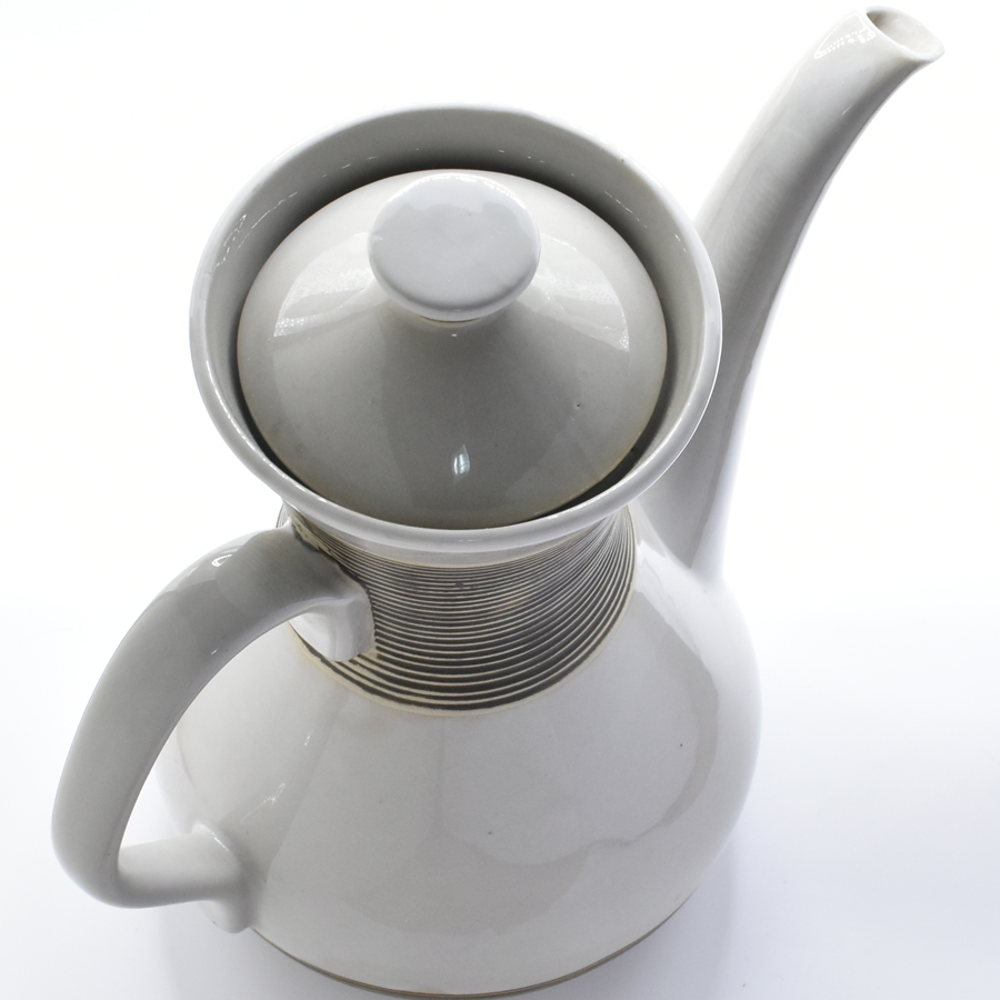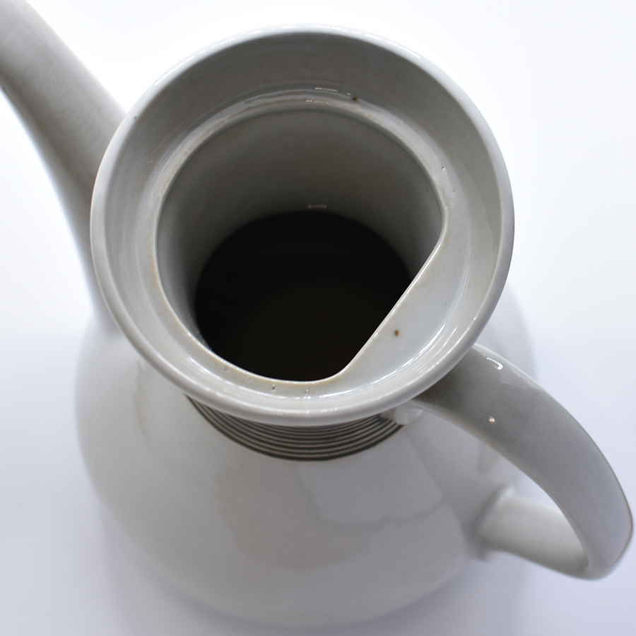 スウェーデン、ロールストランドEntre(アントレ)コーヒーポットです。白に見えますが、実際はやや温かみのあるウォームグレーです。フタの先とリムの白が爽やかなアクセントをつけています。ボディーにはマットな質感でエッチングが施され、つややかな表面とのコントラストは、洗練された大人の仕上がりになっています。容量はいっぱいまで入れると約1リットルです。