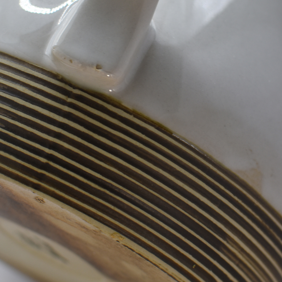 直火にかけたのか底に焦げ付きがあります(直火と言っても北欧では電熱コンロです。ガス火にはかけないでください)。持ち手外側の下部に小さな凹みがありますが、恐らく製造時に釉薬がはじけたものと思われます。また所々薄っすらと茶色っぽくなっていますが、雰囲気を壊す程度ではありません。それ以外にはダメージも無く、良いコンディションです。