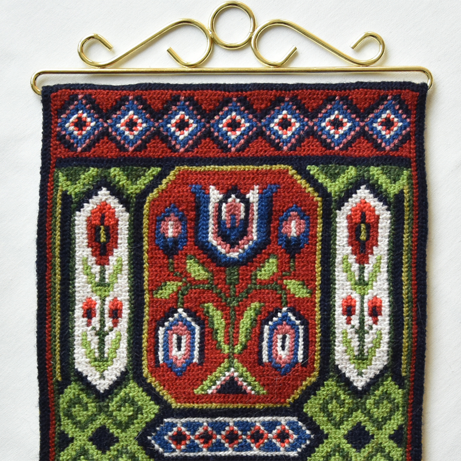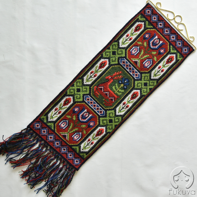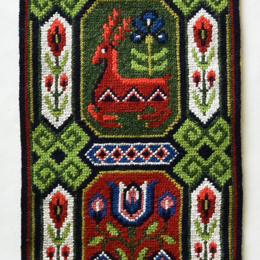 スウェーデンから来たスコーネ地方伝統のツヴィスト刺繍で作った壁飾りクロスです。ウール糸でクラシックな雰囲気の鹿と花が刺繍されています。状態は良く、特に目に付くダメージはありません。